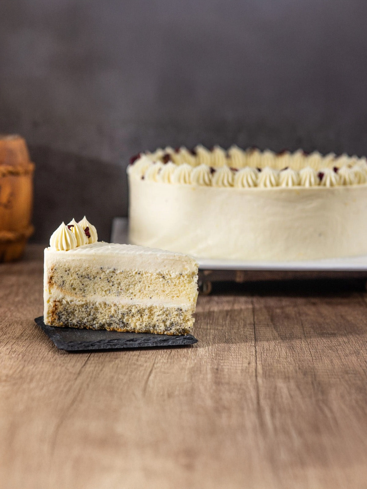 This cake features a combination of spongy poppy seed butter cake layer with lemon cream cheese mousse