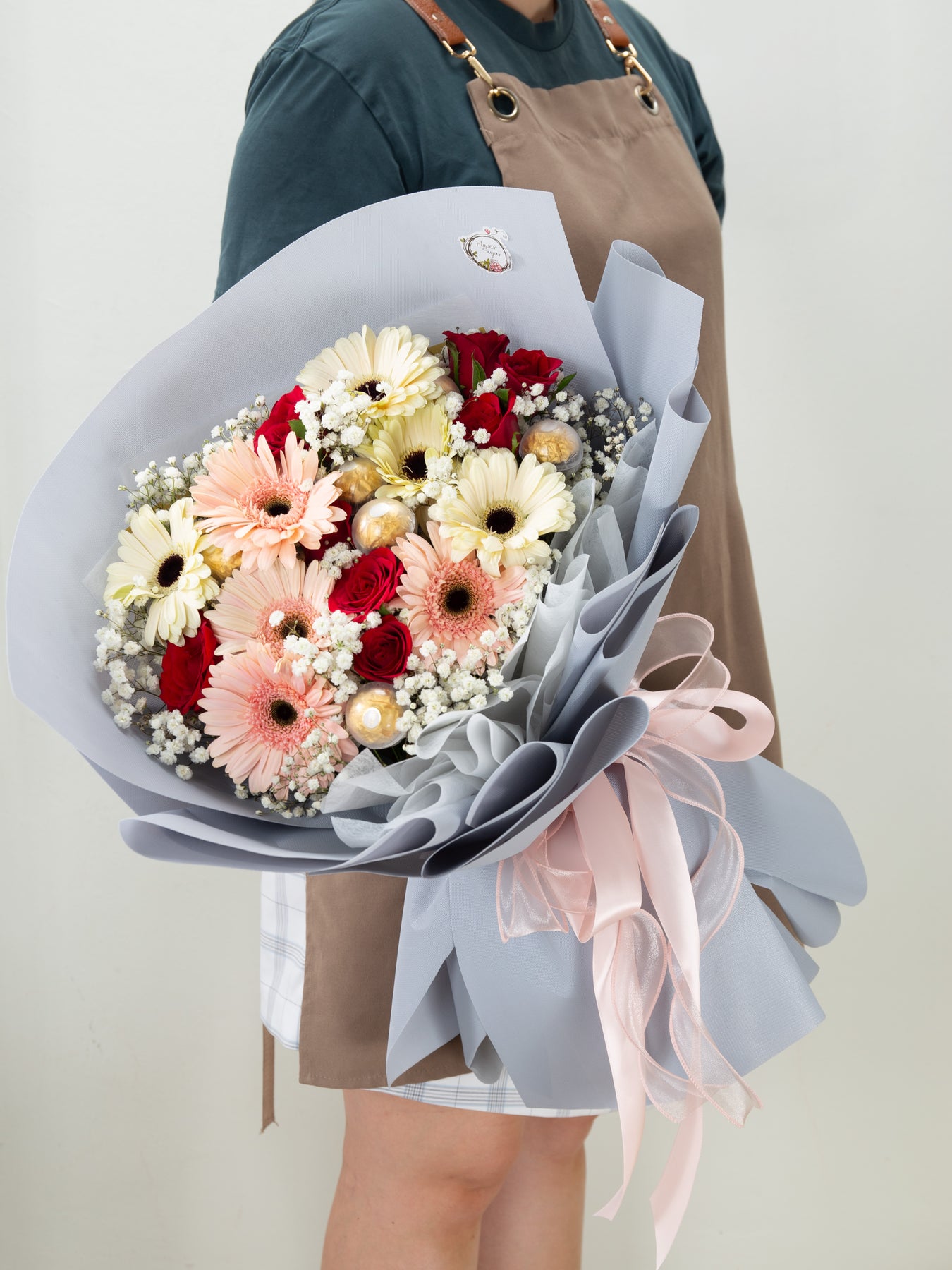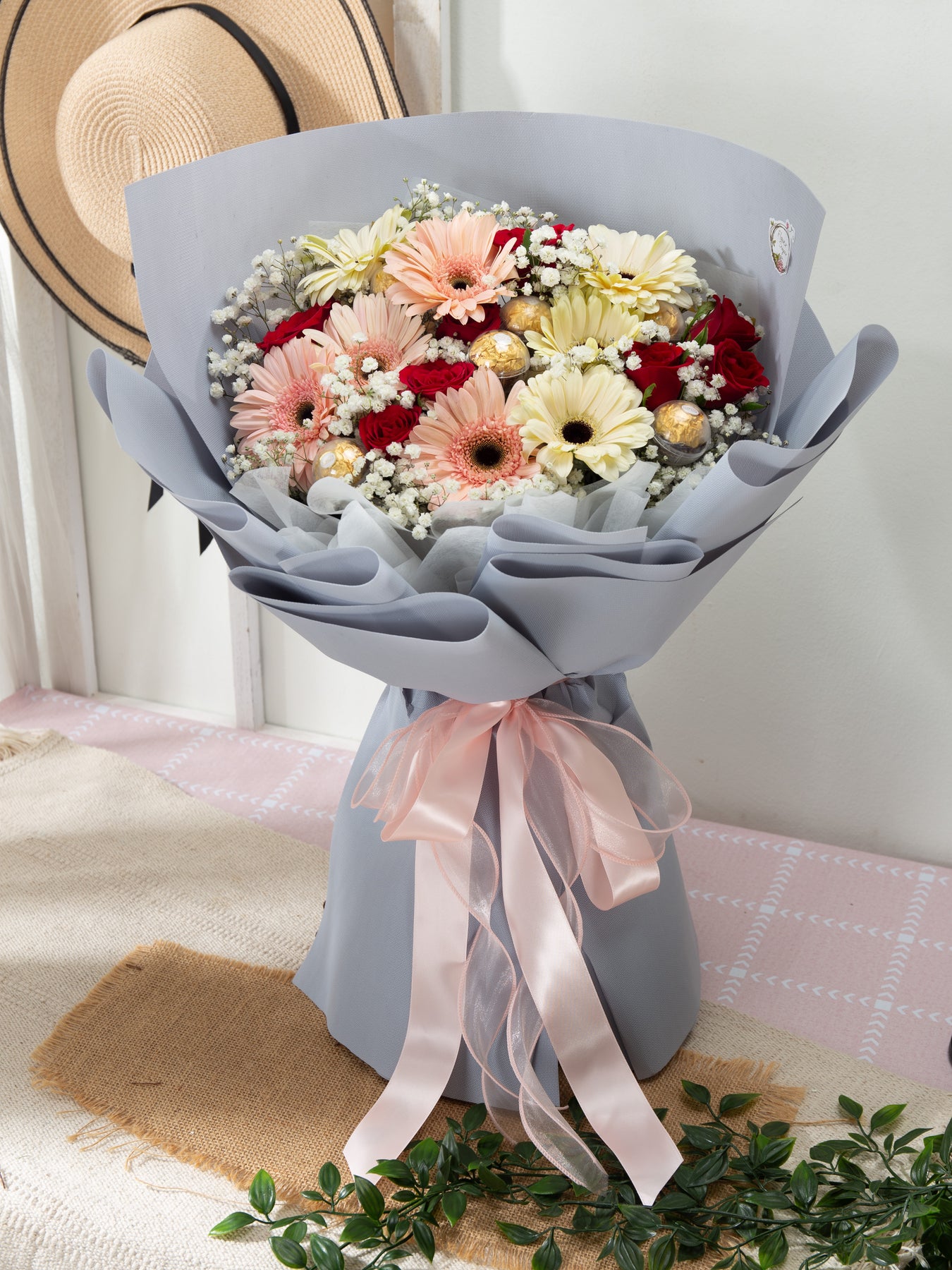 A cheerful and romantic arrangement featuring vibrant gerbera daisies, classic red roses, and delicate baby's breath, beautifully complemented by Ferrero Rocher chocolates. Perfect for sweet celebrations, heartfelt surprises, or simply brightening someone’s day.