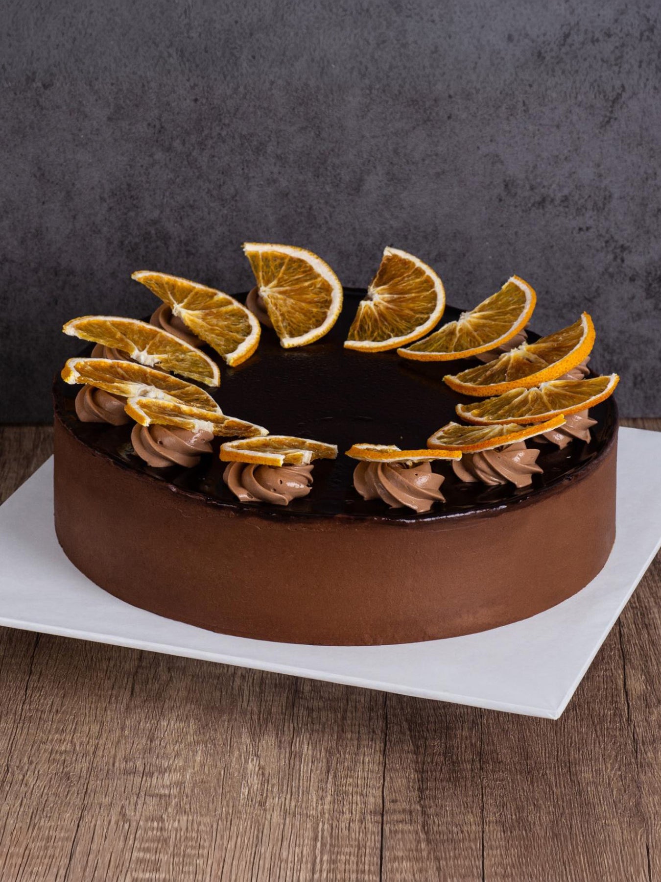 This cake features a combination of  60%-dark chocolate mousse flavored with orange zest and decorated with dried orange chips.