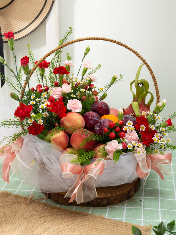 Send your well wishes with our fruit basket. This item consists of peach, plum/apricots, orange and dragon fruit.