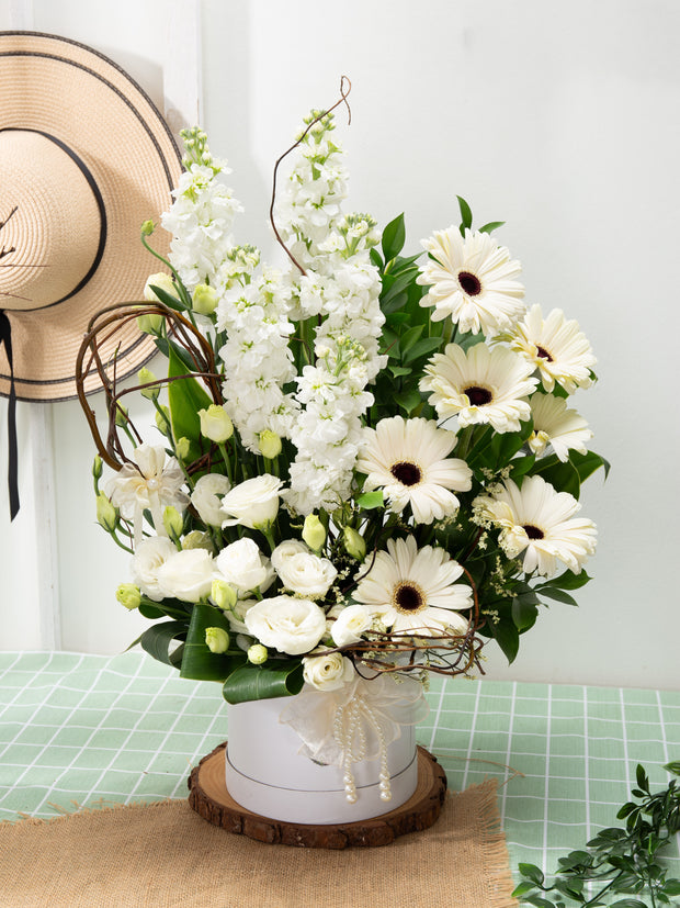This flower box comprises white matthiola, gerbera daisy and eustomas. This all-white arrangement symbolizes: Pure intentions, graceful affection, and peaceful devotion. In East Asian culture, white flowers are also associated with condolences.